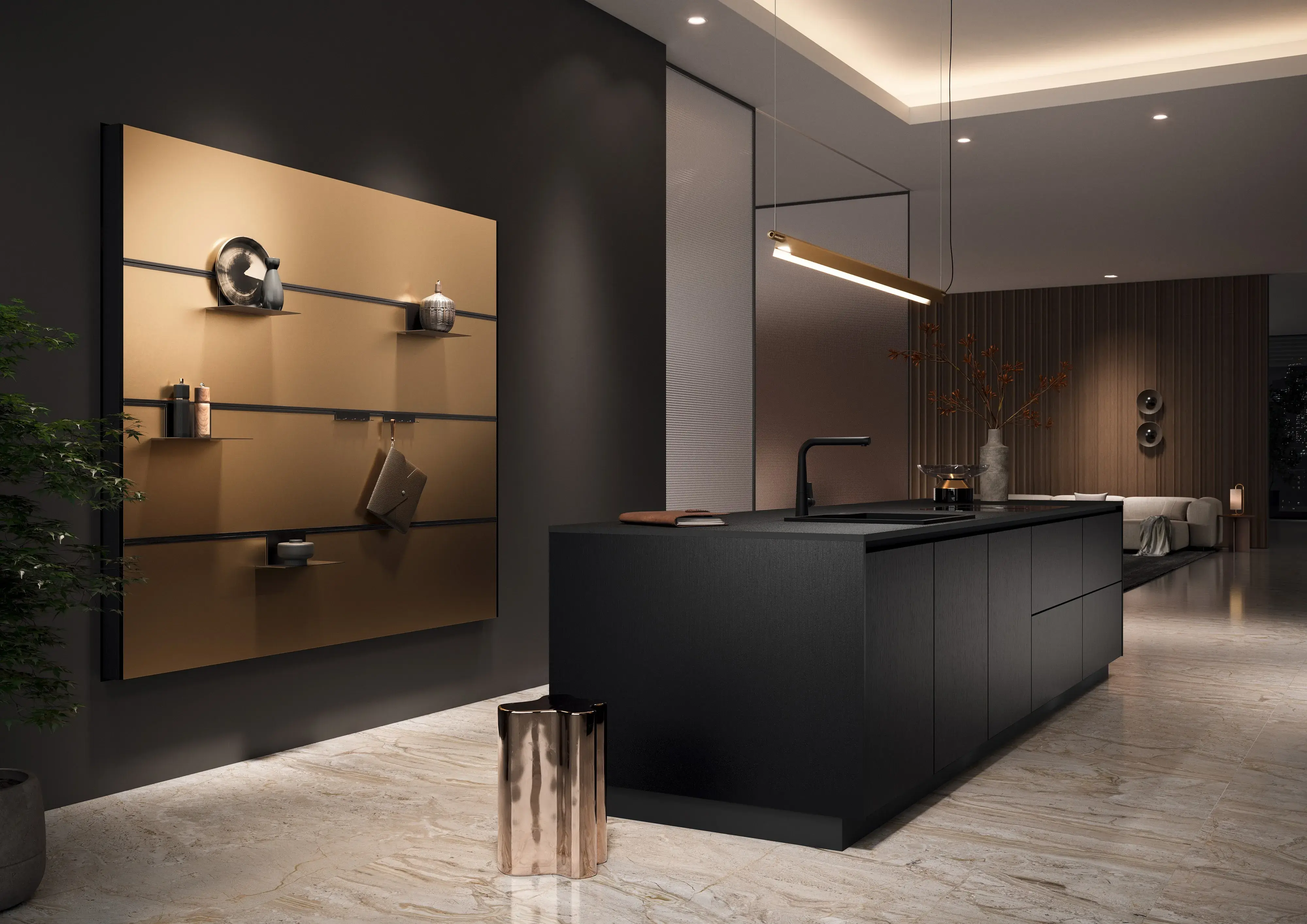 Häcker systemat Schwarze Kücheninsel vor wandbündiger Küchenzeile in Wildeiche